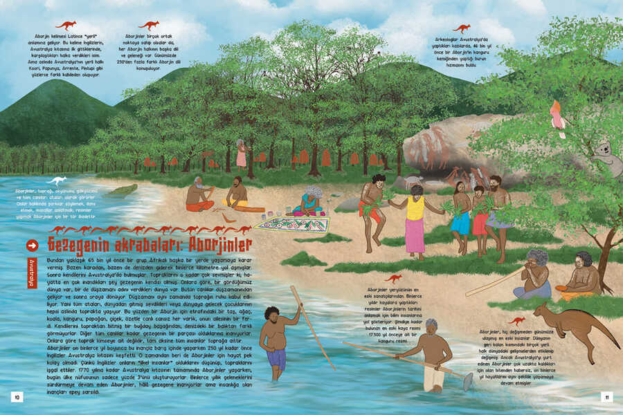 12 bin yıl önce dünyadaki bütün insanlar acıkınca ya avlanıp ya da ormandan yiyecek toplayıp yiyorlardı. Yiyecek bulamazlarsa da göçüyorlardı. Artık dünyadaki insanların çoğu yüksek binalarda yaşıyor, marketlere gidip nereden geldiğini bilmedikleri yiyecekleri tüketiyorlar. Fakat hepsi değil. Dünyanın birçok yerinde hâlâ avlanarak, göçerek, kendi yiyeceklerini ve kıyafetlerini üreterek, binlerce yıllık geleneklerini koruyarak yaşayan milyonlarca insan var. Mesela dünya haritasının sağ alt tarafına gitsen, Avustralya’da 65 bin yıldır geleneklerini yaşatan Aborjinlerle karşılaşacaksın. Oradan biraz yukarı çıkarsan Endonezya’da, annelerin yönettiği Minangkabau insanlarını göreceksin. En yukarıya doğru gidersen, Kuzey Kutbu’nun yakınlarında her yıl kızakla 1500 kilometre yol giden Nenetlere rastlayacaksın. Biraz ısınmak için güneye gidersen, Tanzanya civarında 10 bin yıldır aynı şekilde yaşayan Hadzabe kabilesine selam verebilirsin. Sola doğru devam edersen gezegene en az karbon ayak izi bırakan orman insanları Pigmelerin çadırlarına misafir olabilirsin. Okyanusu aşıp Güney Amerika’ya geçersen erkeklerin kadınların soyadını aldığı Kuna kabilesine uğramayı ihmal etme. Amazonlara yolun düşerse, gece hamaklarda uyuyan Tikuna kabilesini ziyaret edebilirsin.